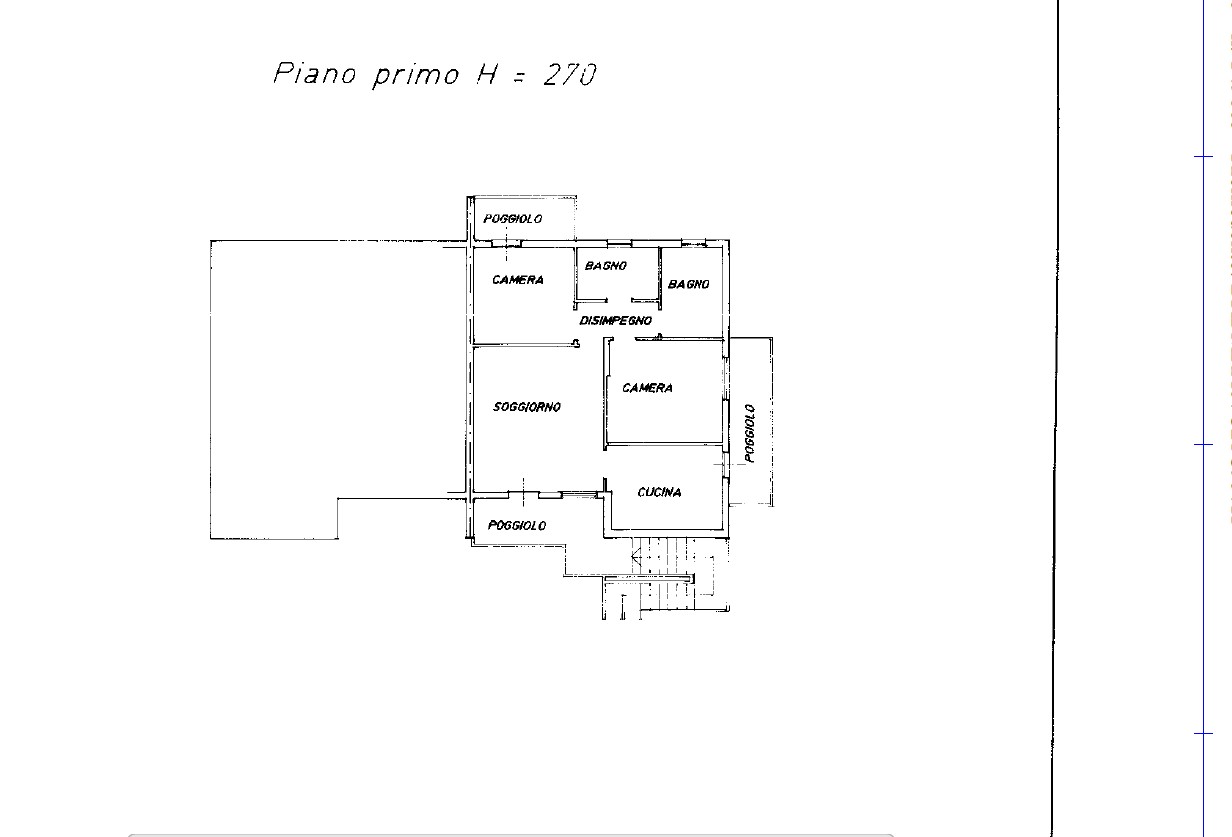 Al piano primo troviamo la zona giorno, ampia circa 30 m², è composta da soggiorno e cucina separata, mentre la zona notte ospita una camera matrimoniale di 14 m², una camera singola di 10 m² e due bagni finestrati, uno con vasca e uno con doccia.