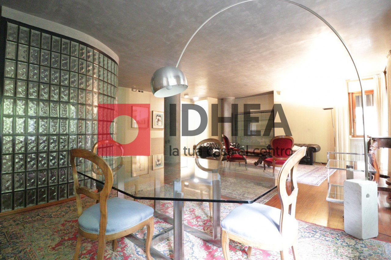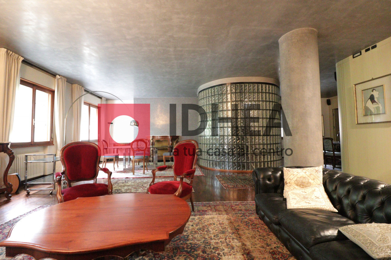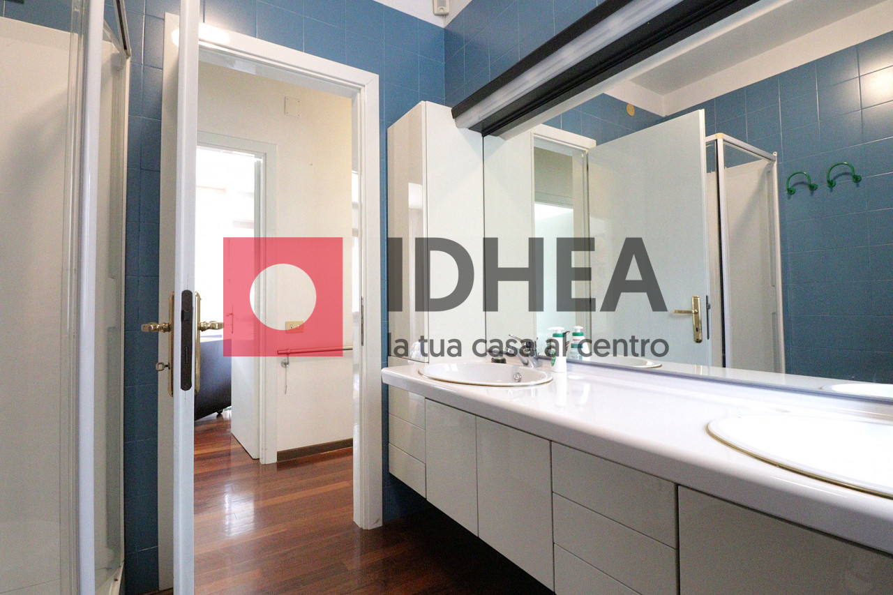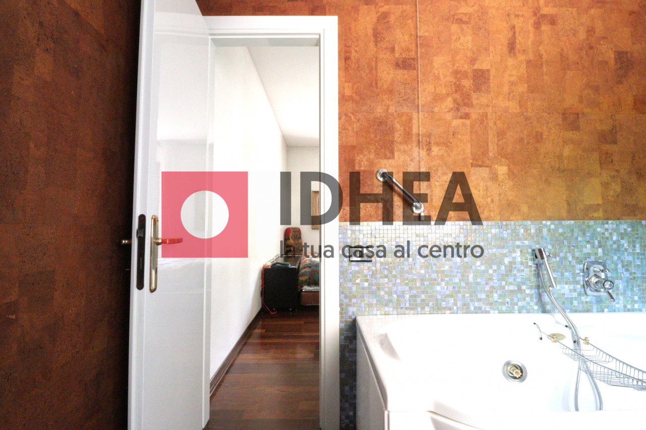 Ad accoglierci una zona giorno dalle metrature introvabili, di ben 72mq, con accesso al terrazzo. Gli spazi lungo le pareti sono stati sfruttati per ottenere una boiserie di armadi su misura adibiti a guadaroba/libreria a servizio di ingresso e zona studio, mentre parte del salotto è dedicata a zona living e sala da pranzo inserita in nicchia di vetromattone. Da qui accediamo alla cucina, fornita anche da una stanza che funge da dispensa. A completare la zona giorno una luminosa veranda con lavabo.